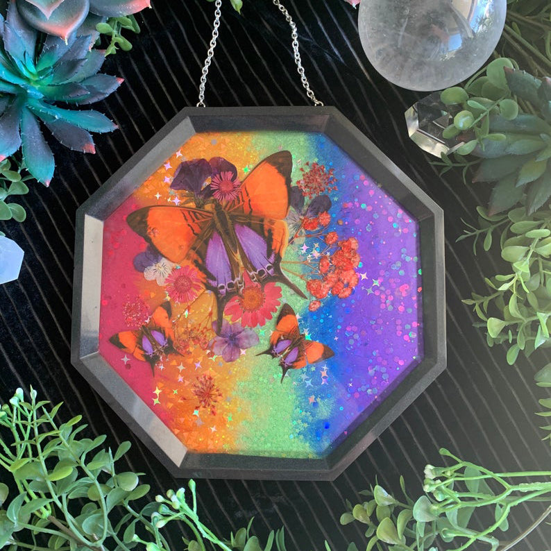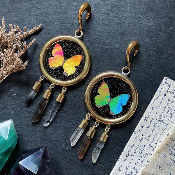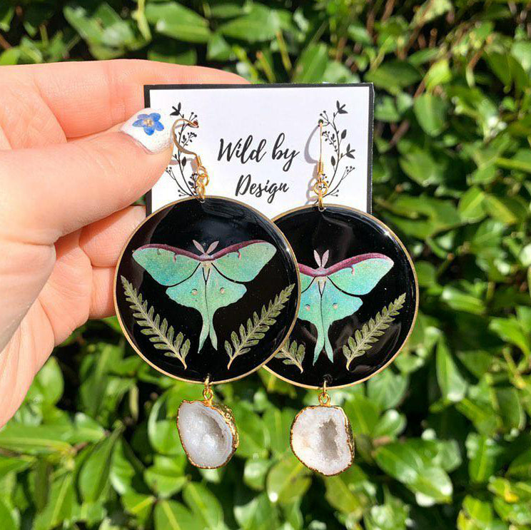 Portland-based artist Roxy Schultz creates gorgeous jewelry and mixed-media art featuring pressed botanicals andΒ our paper moths and butterflies.Β Her one-of-a-kind pieces preserve the fleeting beauty of flowers so wonderfully, and capture the soft whimsy of spring. Our tiny Micro butterflies and moths are especially lovely in her delicate creations!