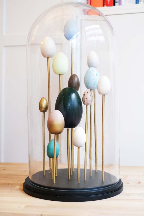 Now you're on a roll! Continue to place your next eggs cutting the dowels to size (alway check twice that the length is what you want before cutting)Β with the wire cutters and drilling a 1/4" hole to place in base.Β Make sure they all fit inside your glass cloche!Β Do not glue the dowels to the base until you're happy with the arrangement. Once you are happy, lift dowels out put a pea size drop of hot glue in the holes in the base and place the dowels back holding in place while the glue dries.