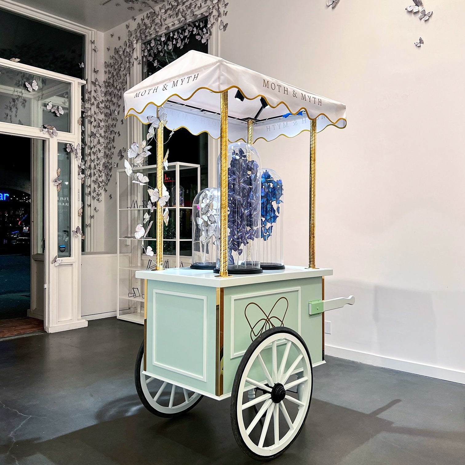 At the centerpiece, holding our large-scale bell jars, is theΒ fancifulΒ Moth and Myth 'ice-cream' cart, which we can't wait to take to events and conventions!Β