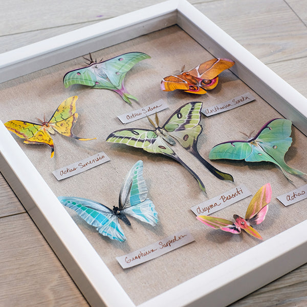 Its easy to make a Vegan Shadowbox with Moth and Myth paper moths! All you need are paper specimens, a pen and paper, glue dots, and a box.Β