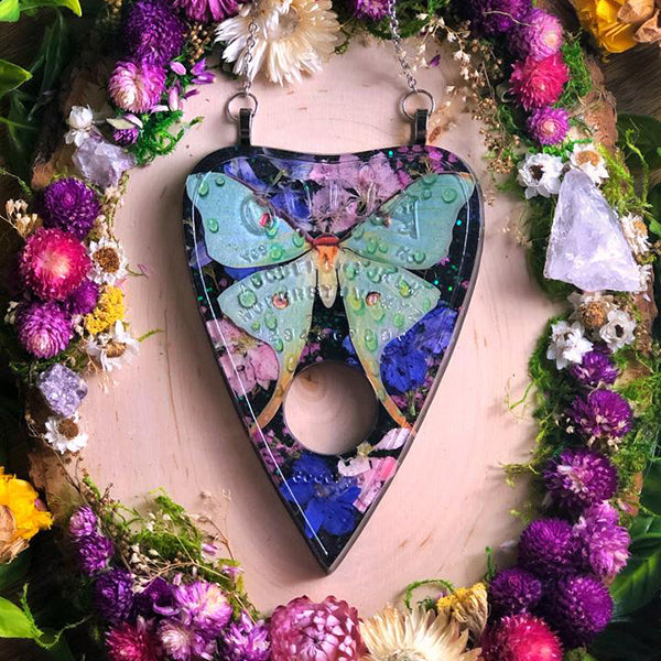 ElegantΒ wall-hangings by resin artistΒ The Moon Indigo, featuring Moth and Myth paper moths and butterflies. Pressed flowers accentuate the colors of the cruelty-free specimens so nicely!Β For availability and more information, please visit their shop!Β